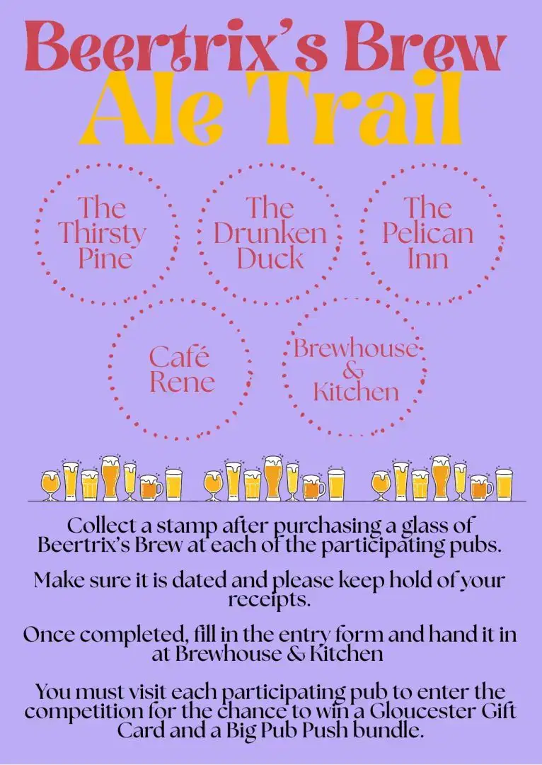 Take the trail, taste the ale! Pick up your Ale Trail card and enjoy a pint (or half) of Beertrix’s Brew in any of the participating pubs. Each stop earns you a stamp – collect them all and return your completed trail card to Brewhouse & Kitchen at the historic Docks.