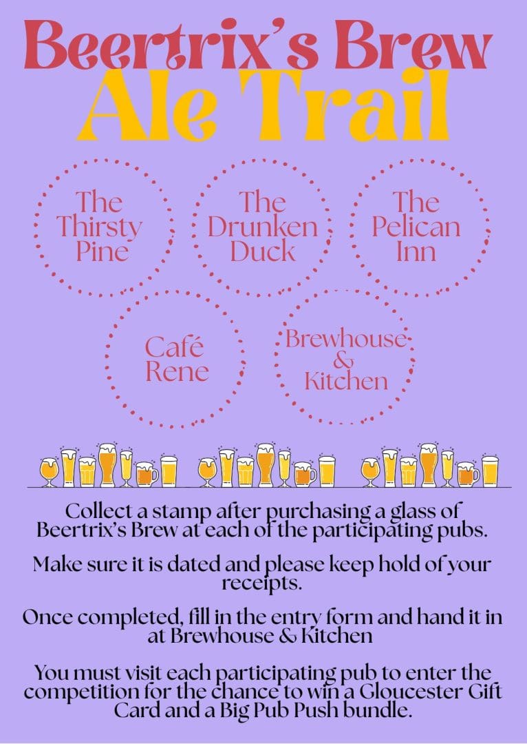 Take the trail, taste the ale! Pick up your Ale Trail card and enjoy a pint (or half) of Beertrix’s Brew in any of the participating pubs. Each stop earns you a stamp – collect them all and return your completed trail card to Brewhouse & Kitchen at the historic Docks.