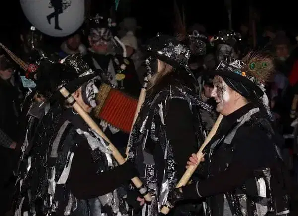 Styx of Stroud is a mixed Border Morris side, launched in 2012 to perform traditional and contemporary dances in the Border style – so like the best cider, that’s from the borders of Herefordshire, Shropshire, Worcestershire and (just a little bit) Gloucestershire. We wear tattercoats, black with flashes of red and green to reflect the felt-making heritage of our home town of Stroud in Gloucestershire. Where we still make the yellow stuff for all the tennis balls at Wimbledon and the green for snooker tables (fun facts). We paint our faces with masks as a disguise, just like the old boys did back in the day with soot and fat. We don’t have to use soot and fat, although some of us do like a bit of lard. And our kit is a mix of tatters and lace, corsets, boots, a bit of steampunk, bells and black hats with feathers and flowers, with our hand-whittled sticks made of hazel.