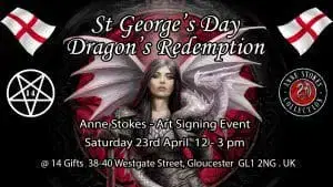 The 23rd of April is St George’s Day where many people in the UK celebrate a knight slaying a dragon. To redress the balance, join us for the Dragon’s Redemption! A fantasy art signing event at 14 Gifts in Gloucester. Anne Stokes will be in the shop from 12 until 3pm and will be signing any item purchased there with her art on. Legendary dragon sculptor John Woodward also joins the event in support of this noble creature. There will be many dragon themed items featuring Anne and John’s work in store and a large dragon throne and dragon’s eggs for photo opportunities.